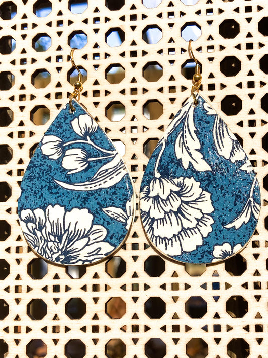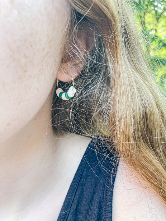 Gold Hoop Earring with Green, Peach and White Polymer Clay Beading